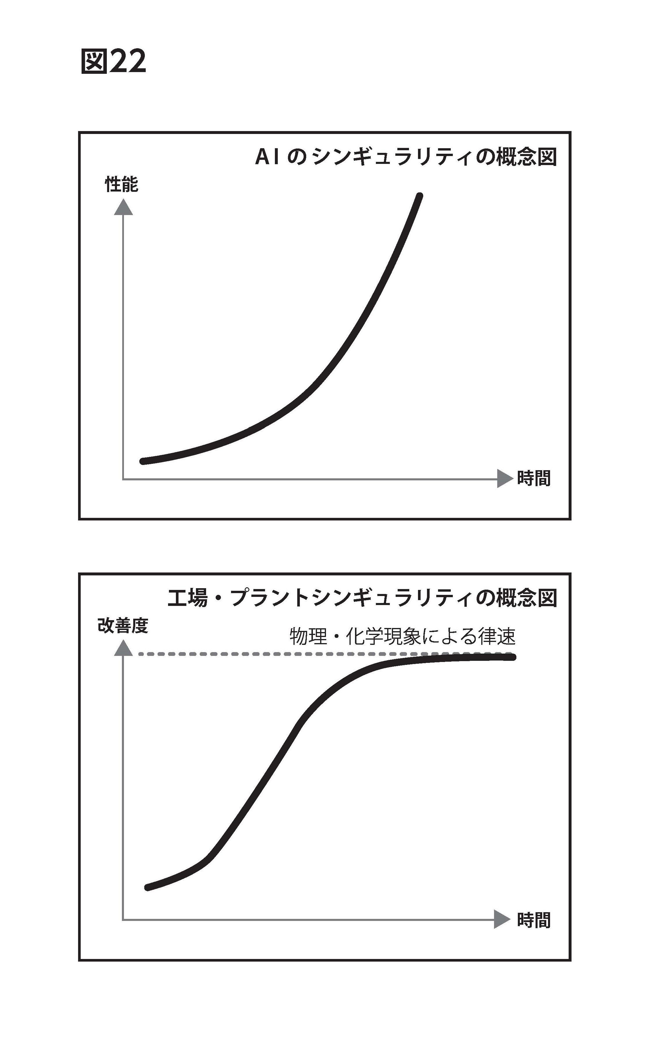 AIによる自律PDCAループの美しい点は、工場・プラントが、自分自身を改善していくというところです。AIがもしも自分自身を改善できるとした場合、AIは無限に性能を上げてついには人間を超えていくという概念は、AIのシンギュラリティ(特異点)と呼ばれます。このAIのシンギュラリティと同じように、工場・プラントが自分自身を自律的に永久に改善していく概念は、製造業における「工場・プラントシンギュラリティ」と呼べるものです。自律PDCAループはAIシンギュラリティの製造業版プラントの持つ能力を最大限発揮する(つまりそれ以上の改善の余地が無くなる)状態へ自律的に到達することになります(図22)。