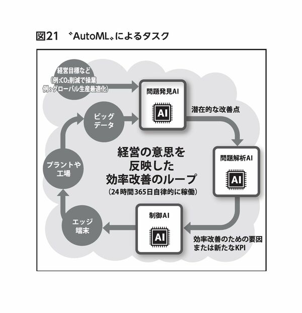 これを実現するために、図21のように、3つのAIを組み合わせます。プラントや工場から収集される全データに対し、経営もしくは現場長の方針に従って、“AIが”疑問符のつくデータ箇所を見つけます。AIが経験豊富な現場の人材に代わってタスクを実行するわけです。ここで使われるAIを問題発見AIと呼びます。