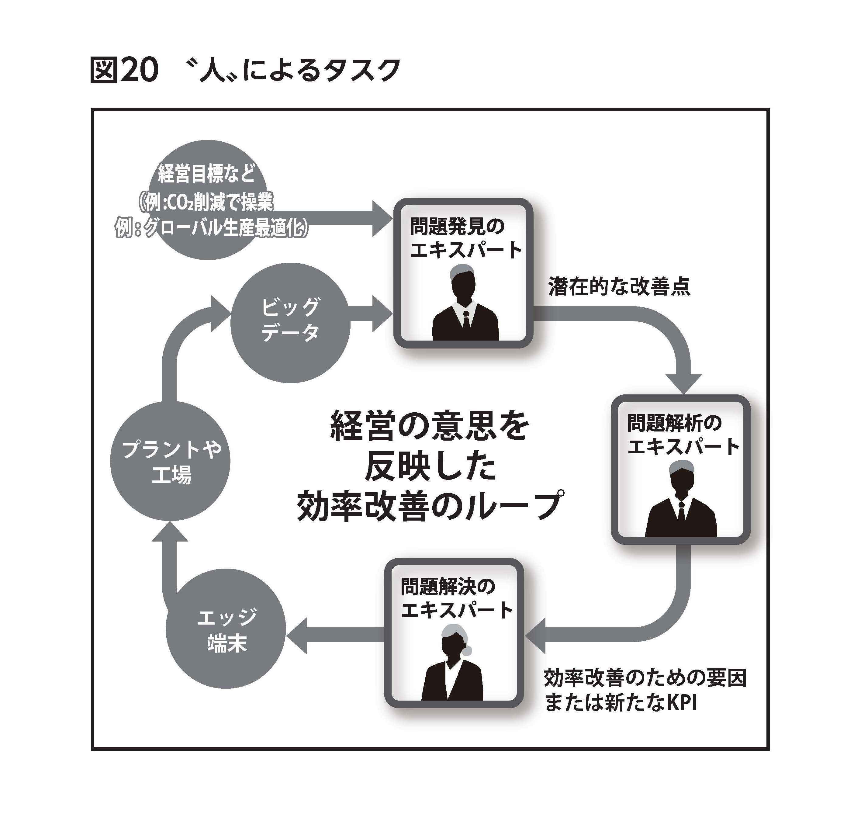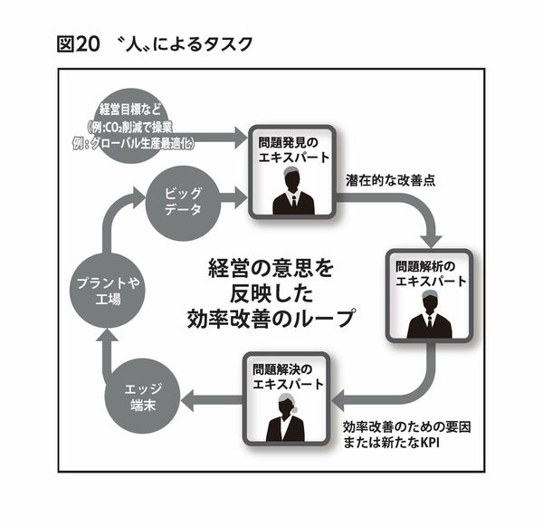 一方、本書でフォーカスしたいのは、②の「ヒューリスティックタスク」の部分です。これは手順が決まっておらず、つまり新たに手順を探す必要があるタスクのことで、具体的な例として、効率改善のPDCAループ(図20)があります。製造の最終成果物に品質や製造効率の問題が生じた時に、“人が”データと成果物を見極め、どのデータ部分に改善のキーがあるかあたりをつけます。これはおそらく現場でもかなりの経験がある人材が行っている部分だと思います。