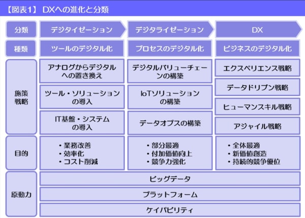 企業変革が求められる現代において、その変革は、「デジタイゼーション」「デジタライゼーション」「デジタルトランスフォーメーション」(DX)へと進化を遂げています。それぞれの変革プロセスには、異なる施策と戦略が存在し、それに沿って最終的な目的が達成されることになります。