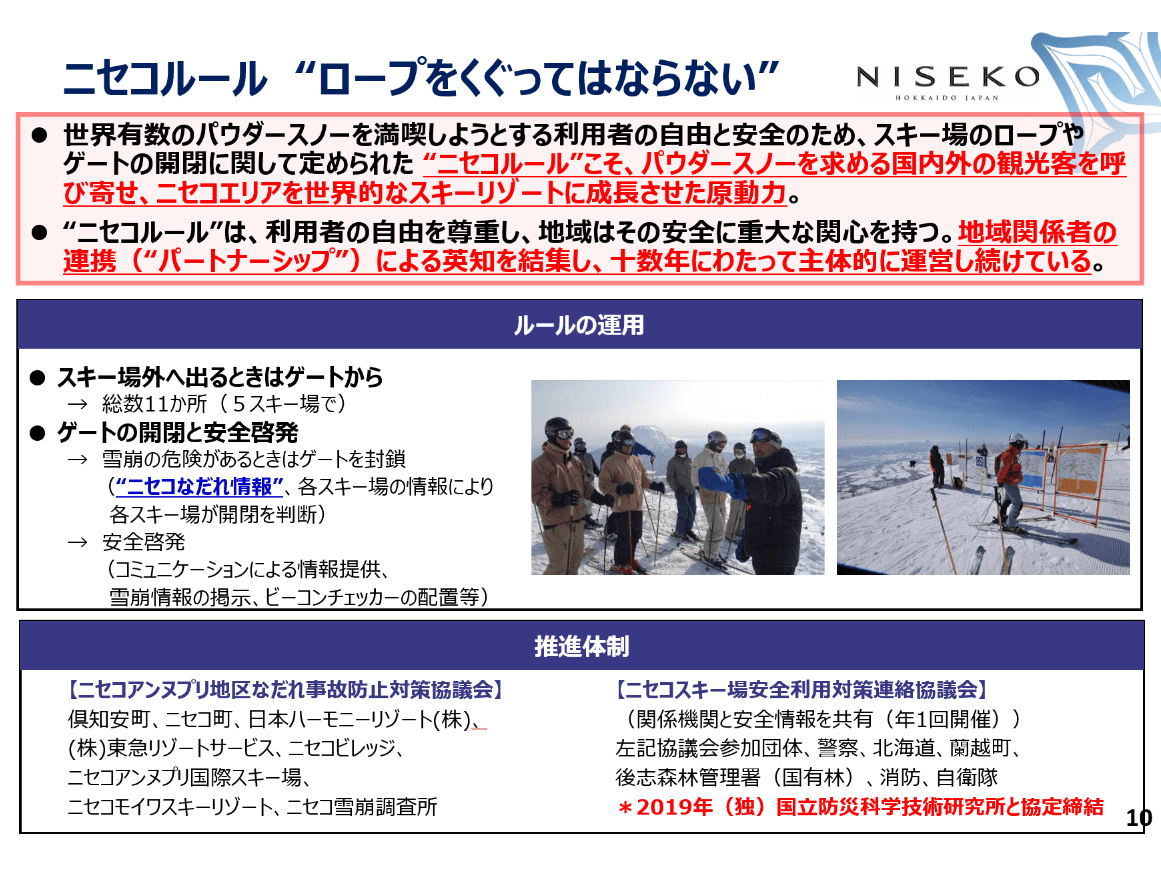 同時に約10カ所のゲートを設け、雪崩リスクが高いときはゲートを閉めてスキー場外に人が出られないようにし、雪崩リスクが低いときは、自己責任で場外に出られるようにした。