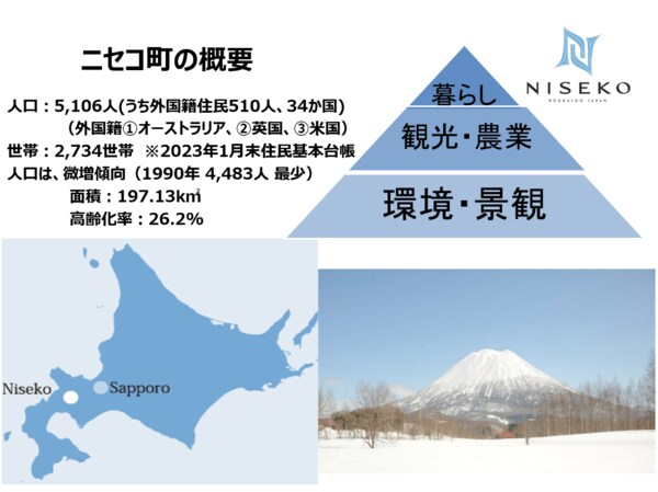 世界的に注目されているスキーリゾート地のニセコ観光圏は、ニセコ町・倶知安(くっちゃん)町・蘭越(らんこし)町の3つの町で構成されている。そのうちニセコ町の町長である片山健也氏はニセコの現状について次のように説明する。