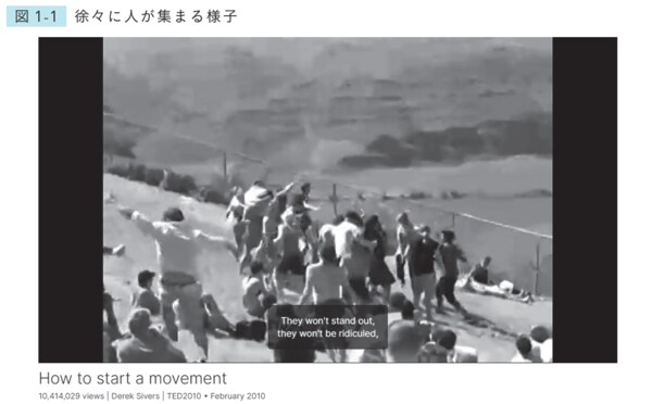 このプレゼンの冒頭では、とある野外フェスの会場で撮影された動画が紹介されています(図1-1)。その動画は、1人の上半身裸の男性がフェス会場の音楽を聴きながら、少し変わった奇妙な踊りを踊っているところから始まります。最初は1人の変わり者が踊りを踊っているだけなのですが、どこからともなくもう1人の参加者が彼に近寄ってきて、同じような踊りを踊り始めます。そして、後から来た参加者がはじめに踊っている彼の踊りを周囲にアピールするように踊り出し、徐々に周りからその様子を見た人が集まってきます。すると、最初は相手にしていなかった周りの傍観者が、次第に彼の踊りに参加し始め、いつの間にか「参加しないと損」とすら思わせるような、巨大なムーブメントに発展していくのです。