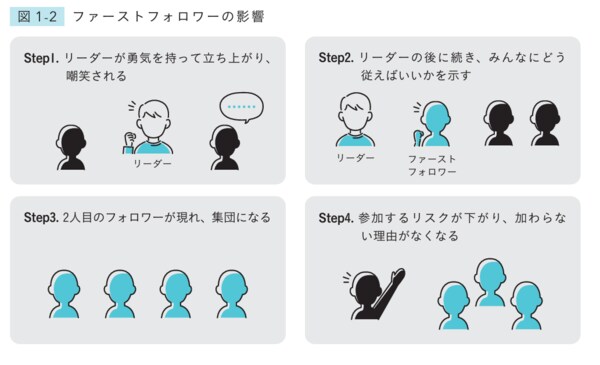 このプロセスのなかで、ファーストフォロワーはリーダーに追随して価値を受け取るだけの存在ではなく、その体験の価値を他者に伝え、仲間を呼び込む役割をも担っていることがわかります(図1-3)。