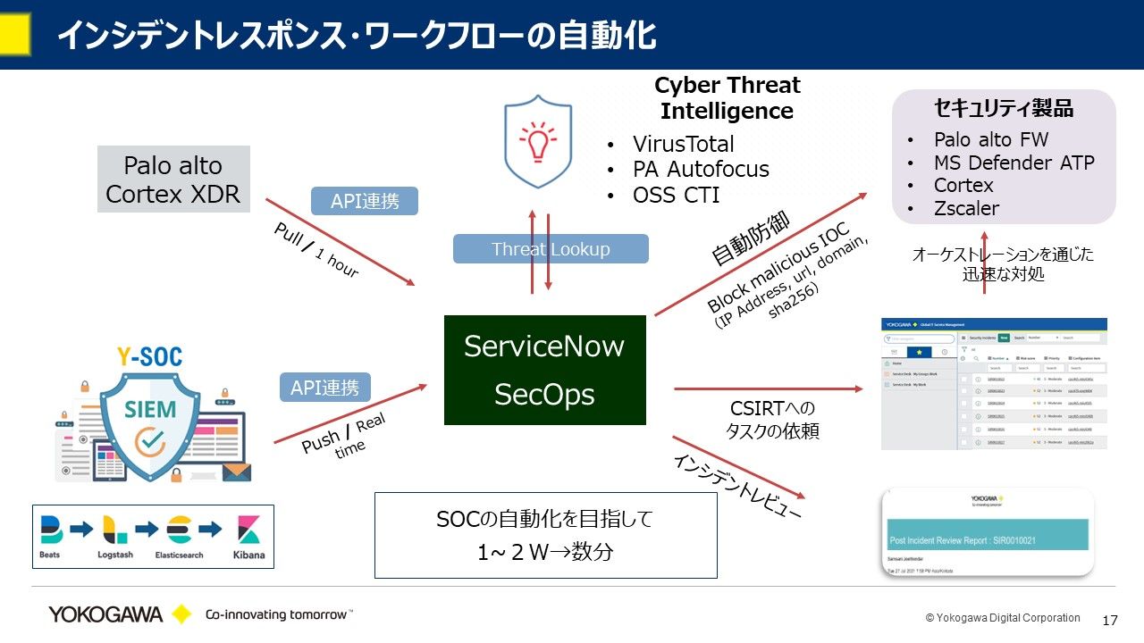 全体のアーキテクチャーをご説明すると、セキュリティオペレーションセンターはクラウドタイプのSIEMをElasticを使って開発しました。インシデントが検知されると、そこからServiceNowのSecOpsにAPI連携され、チケットが発行されます。また、サポート切れOSについては、Palo AltoのCortex XDRを入れました。そこもAPI連携され、1時間ごとに情報が提供されます。