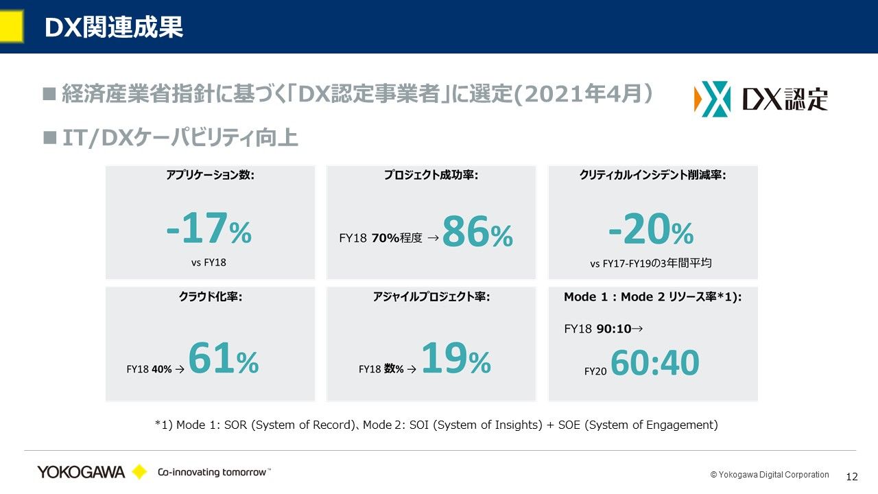 このようなこともあり、おかげさまで、2021年4月には横河もDX認定事業者に選定されました。そこに至る過程においては、KPIとして、アプリケーション数、プロジェクト成功率、クリティカルインシデント削減率、クラウド化率、アジャイルプロジェクト数などについて目標を立て、できるだけモード1からモード2にシフトするように進めてきました。