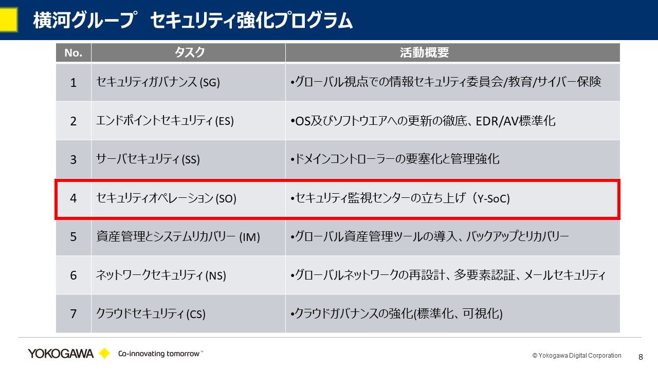 まず、セキュリティガバナンスとして、グローバル視点での情報セキュリティ委員会の編成。そして、パソコンのエンドポイントセキュリティです。横河にはグローバルで3万数千台のパソコンがありますが、それらのOSアップデートやパッチマネジメントを行いました。3つ目がサーバセキュリティで、これはサーバの特権管理がメインです。さらに、セキュリティオペレーションとしてセキュリティ監視センターを自前で立ち上げたほか、上図のとおり、資産管理とシステムリカバリーやネットワークセキュリティ、クラウドセキュリティなどの方針を挙げました。