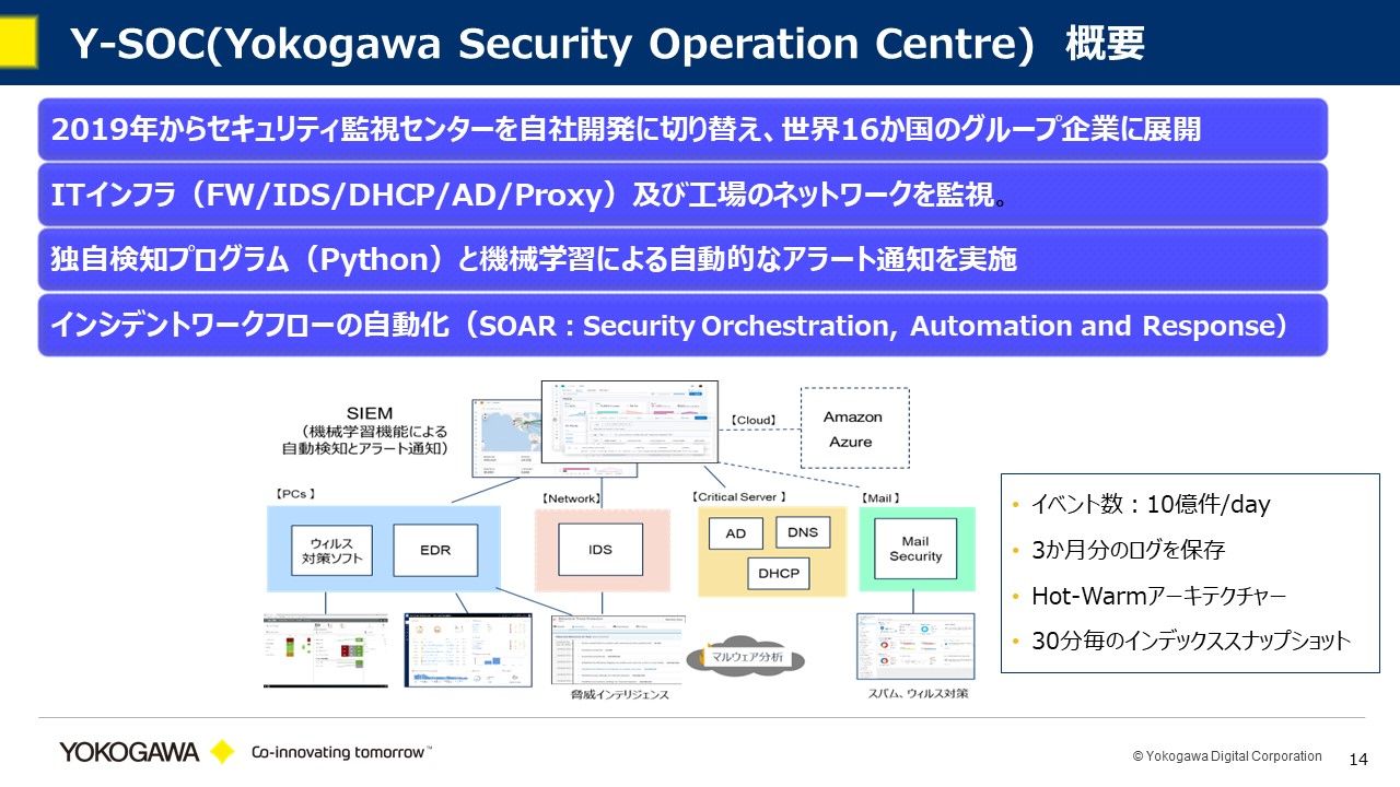 塩崎氏 本日は、その中でも、セキュリティオペレーションセンターについてもう少し詳しくお話しします。われわれは、自前のセンターをYokogawa-Security Operation Center(Y-SOC)と呼んでいます。