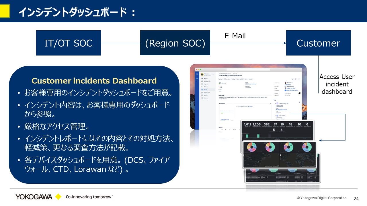 IT/OT SOCの主力メンバーは、インドのバンガロールにいます。後でご紹介しますが、地域ごとにSOCのメンバーをアサインし、彼らがフロントに立ってお客さまに対応するという形を取っています。お客さま専用のインシデントダッシュボードをご用意し、そこから細かい内容が参照できるようになっています。
