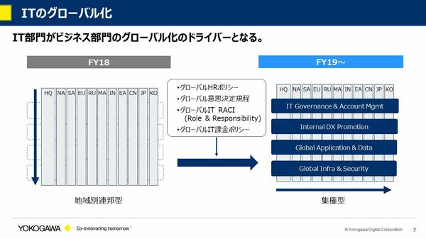 それまでは各国でばらばらだった情報システム部門に対し、右側に示したようなIT GovernanceやInfra&Security、Application&Dataについては、仮想的な横串の組織をつくりました。その上で、グローバルHRポリシーや意思決定規程、RACIチャートやIT課金ポリシーの制度を整備することにより、デジタルトランスフォーメーションを推進する体制を取りました。