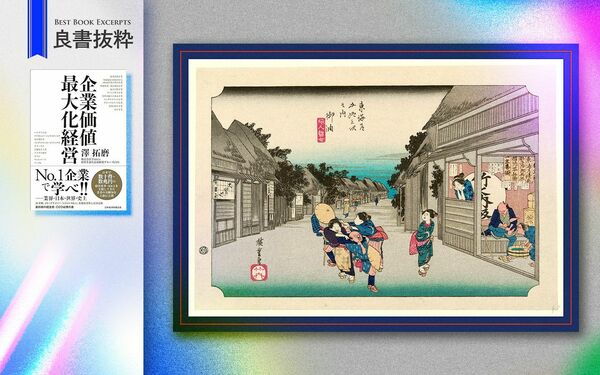 業歴200年を超える超長寿企業は建設工事業、酒類業、宿泊業、卸小売業等に多い。写真は多くの店や旅館に挟まれた通りを歩く旅人を描いた安藤広重の浮世絵。写真提供:Universal Images Group/共同通信イメージズ