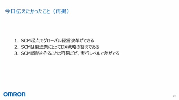 本日は、伝えたいことが3点あります。1つ目が「SCM起点でグローバル経営改革ができること」、2つ目が「SCMは製造業にとってDX戦略の答えであること」、そして、3つ目が「SCM戦略を作ることは容易だが実行レベルで差が出ること」です。