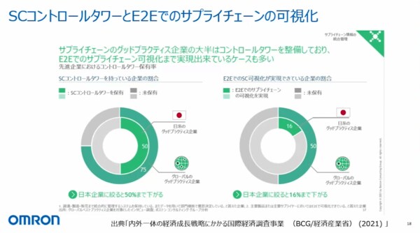 この図のデータで示しているのは、グローバル企業と日本企業の比較です。コントロールタワーについては、グローバル企業の75%は設置しています。それに対して日本は50%です。End to Endの可視化については、グローバル企業は半分、日本のグッドプラクティス企業では16%しか実現していません。欧米企業との差がまだまだある中で、われわれはある程度このようなコンセプトで進めることができているように思います。