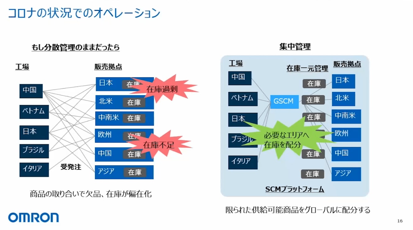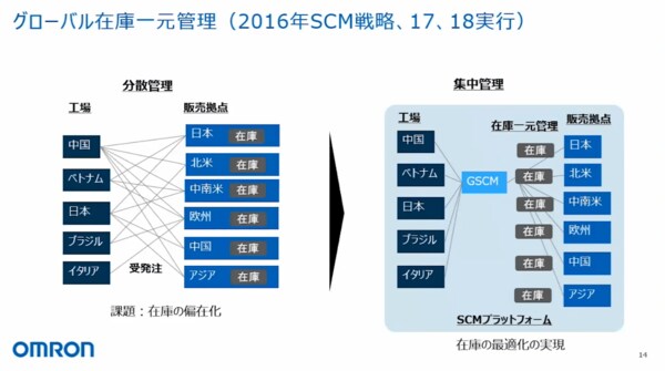 これを、図の右側のような集中管理に変えたのが最初の改革です。集中管理の図の中心には「GSCM」というものが入っていますが、ここが私がいる組織です。この本社のSCMという部門が、グローバルで各販売拠点の在庫を一元管理するというオペレーションに変えました。SCMのプラットフォームとしてシステムを導入し、この一元管理のオペレーションを実現しています。