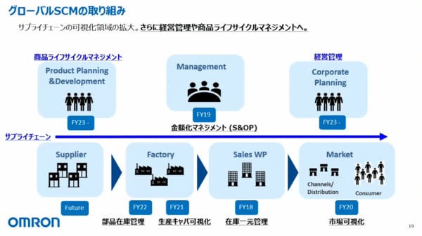 その後、2019年にS&OPマネジメントを導入し、SCMの数量情報をベースに金額化することを行い、2020年には市場側でのデータ、代理店在庫や代理店の売り上げであるセルアウトというような市場の情報の可視化を行いました。その頃、コロナが発生しました。それによって大きな問題が発生したのは供給側なので、供給側を可視化しようと、工場キャパ可視化、部品在庫の可視化を実現しました。