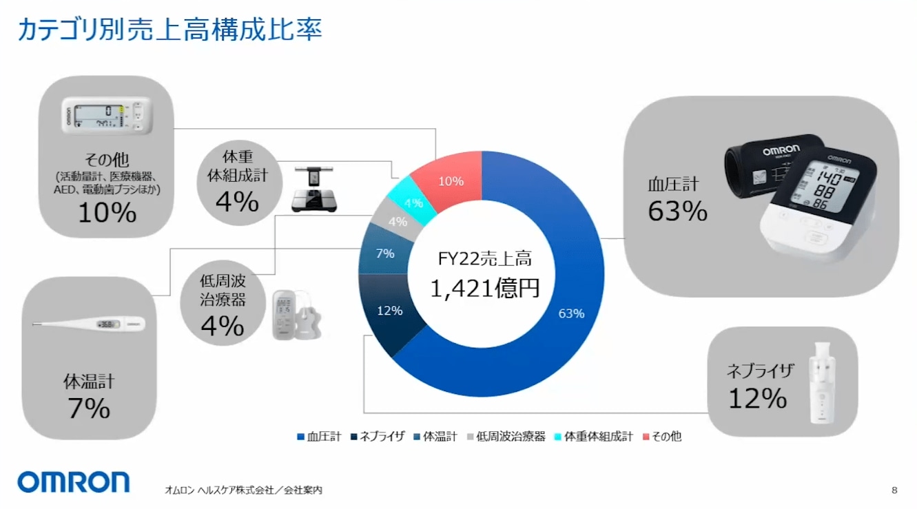 商品では血圧計が全体の63%と大きな部分を占めており、これが事業の柱となっています。そして、ネブライザ、体温計、低周波治療器などが続いています。このような製品群を、グローバルに供給しています。