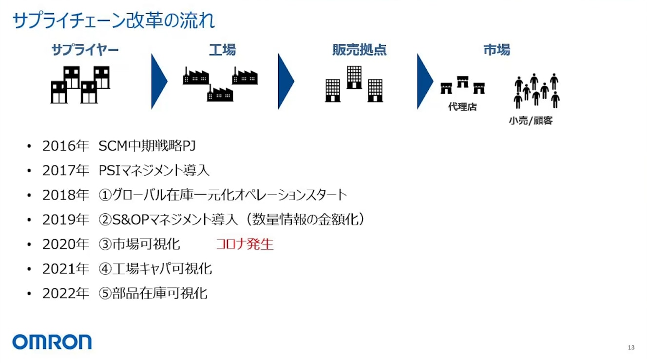 2016年に先ほどの基本戦略を作り、そこから2017年、2018年でSCMのPSIマネジメントを導入しました。PSIは、SCMを担当する方ならご存じかと思います。これを使って、2018年からグローバル在庫一元化オペレーションをスタートしました。