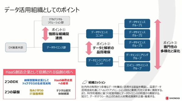 弊社の場合、DX推進本部というDXを推進する組織体があります。その中に、データサイエンス部とIT&デジタルソリューション部があります。1つ目のポイントとして、ITの組織とデータ活用組織が隣に位置していることが非常に大事です。