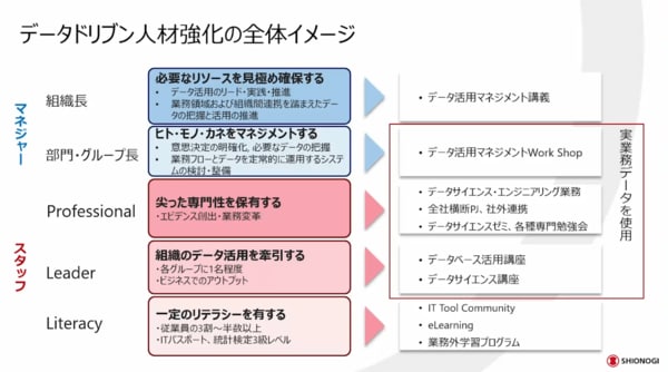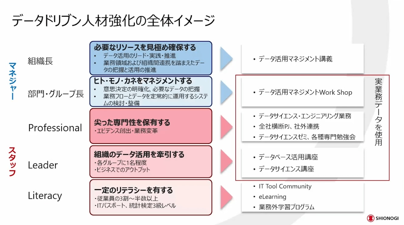 プロフェッショナルの人材ももちろん大事ですし、業務部門のリテラシーを上げてコミュニケーションを円滑に進めるために、階層ごとに多種多様なコンテンツを用意して教育をしています。