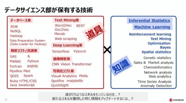 そのような活動を通じてデータサイエンス部が保有する技術として、道具と知識の例をこの図に示しています。