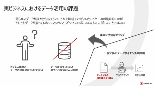 よく言われるのは、「ここにデータがあるから、解析して知見やインサイトを与えてほしい」というようなことです。しかし、実際は、それではなかなかうまくいかないケースが多いと思います。