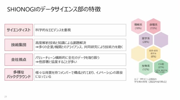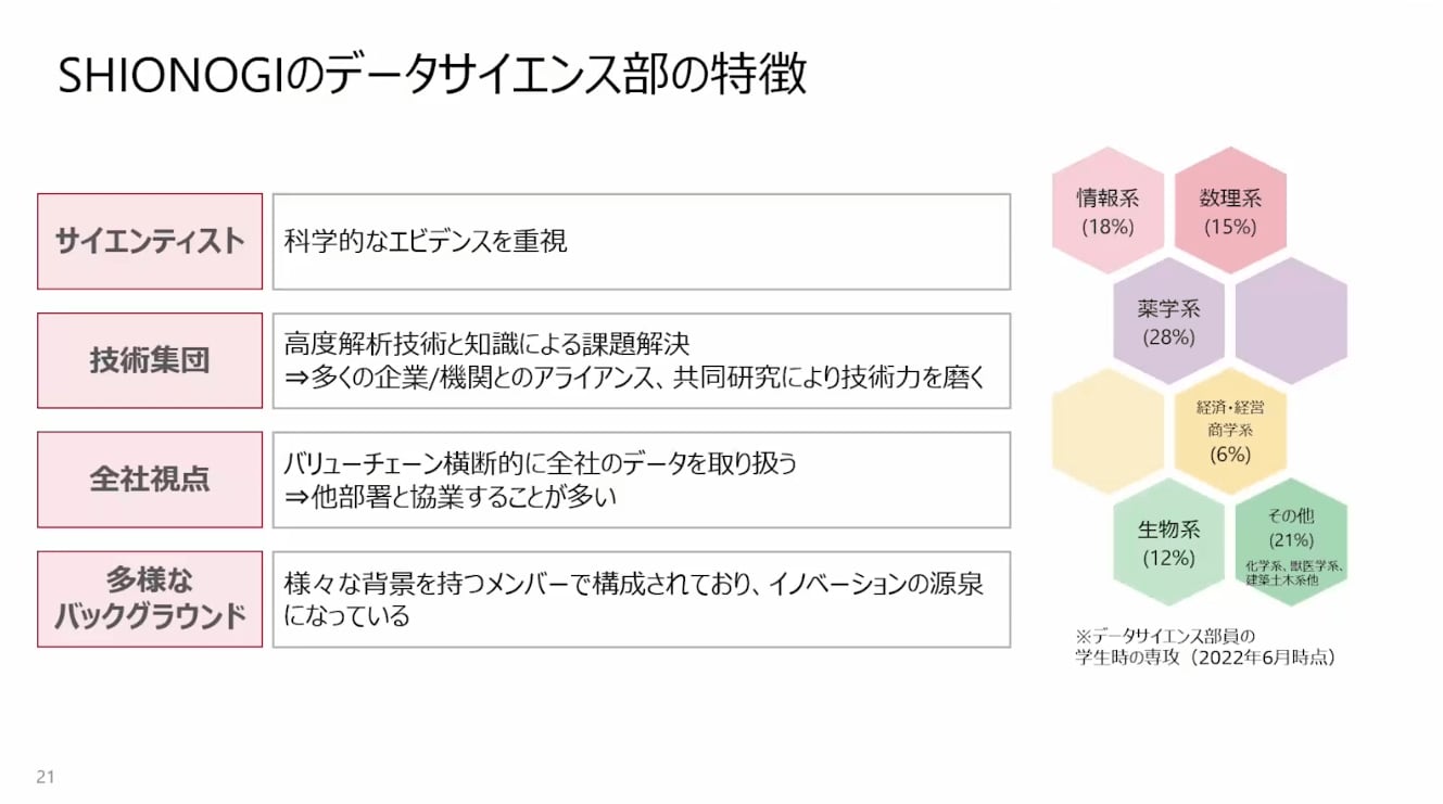 データサイエンス部に所属している人は、情報系か数理出身の人だろうとよく言われるのですが、実はそうではありません。3分の1ぐらいはそのような情報系、数理系の専攻だった人たちですが、残りは薬学系や、最近では経営の解析もしているのでそのような専門のバックグラウンドを持つメンバーもいます。