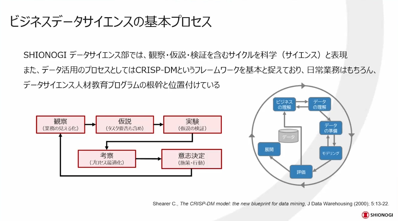 「データサイエンス」なので、サイエンスの基本、例えば観察し仮説を立てて実験し、考察して意思決定をするというサイクルを、いかに高速にかつ高品質に回すかが重要になります。例えばデータで見ても、リアルワールドデータを観察することにより仮説を立てるというプロセスも考えられます。