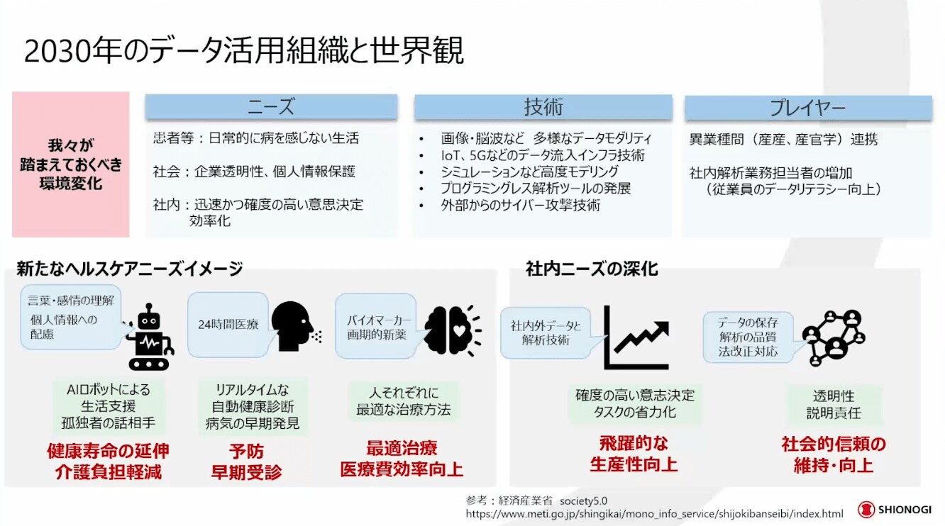 2030年のデータ活用組織と世界観は一体どのようになっているのかを考えると、今とは非常に大きく変わっていると思います。データの多様化と量、リアルタイム性などは、大きく進化しているでしょう。世間のニーズや技術、プレーヤーも大きく変化していると思います。ヘルスケアのニーズイメージも大きく変わり、社内ニーズもより複雑・多様化し、深くなっていると考えます。そのような時に、データは非常に大事なポイントになると思います。