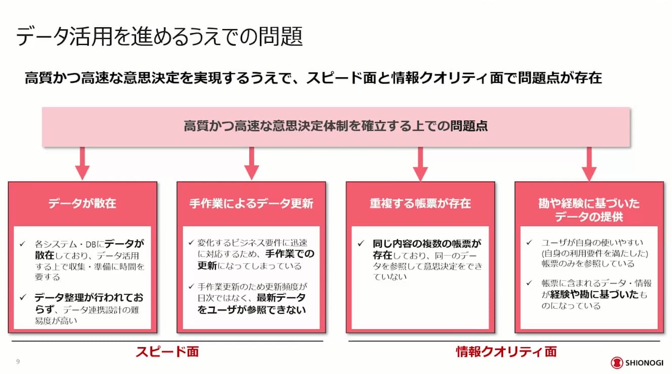 データが散在している、手作業によるデータの更新で非常に時間がかかる、重複する帳票があちこちに存在していて違う結果が複数存在するという場合もあります。また、勘や経験に基づいていて、非常に恣意(しい)性の高いデータを使っているケースもあります。このように、スピード面と情報のクオリティー面で問題点が存在するケースが多々あるかと思います。