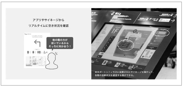 商業施設が入るエリアでは、社員以外にも分かるようデジタルサイネージから確認できるようになっている。利用者の数自体を変えることはできないが、確実にストレスの解消にはつながっている。