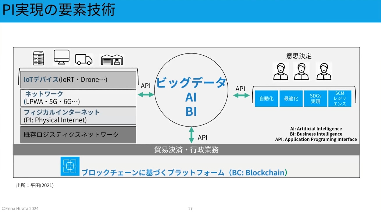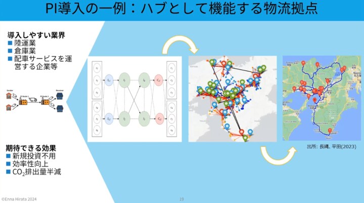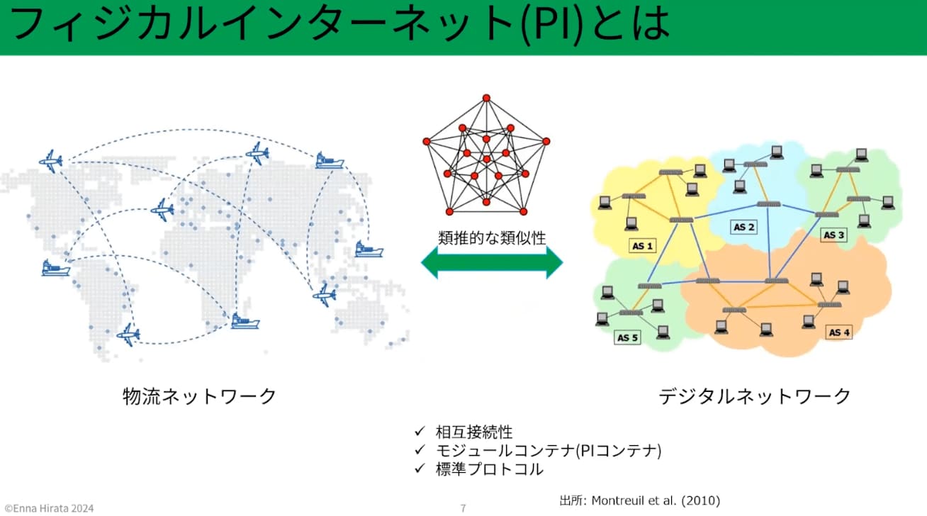 平田氏 フィジカルインターネット実現の要素技術として、私が2021年に発表した論文で提案した次世代物流ネットワーク「PIチェーン」の構成をご紹介します。