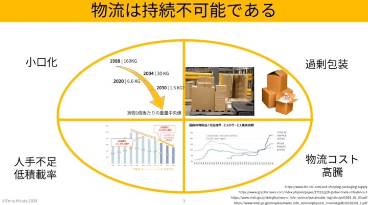 物流は、持続不可能である――小口化や過剰包装、人手不足などのさまざまな課題を挙げてそう語るのは、神戸大学大学院 海事科学研究科・准教授の平田燕奈氏です。平田氏は、現在の物流が抱える問題を一挙に解決する切り札として、次世代物流ネットワーク「フィジカルインターネット」を紹介します。