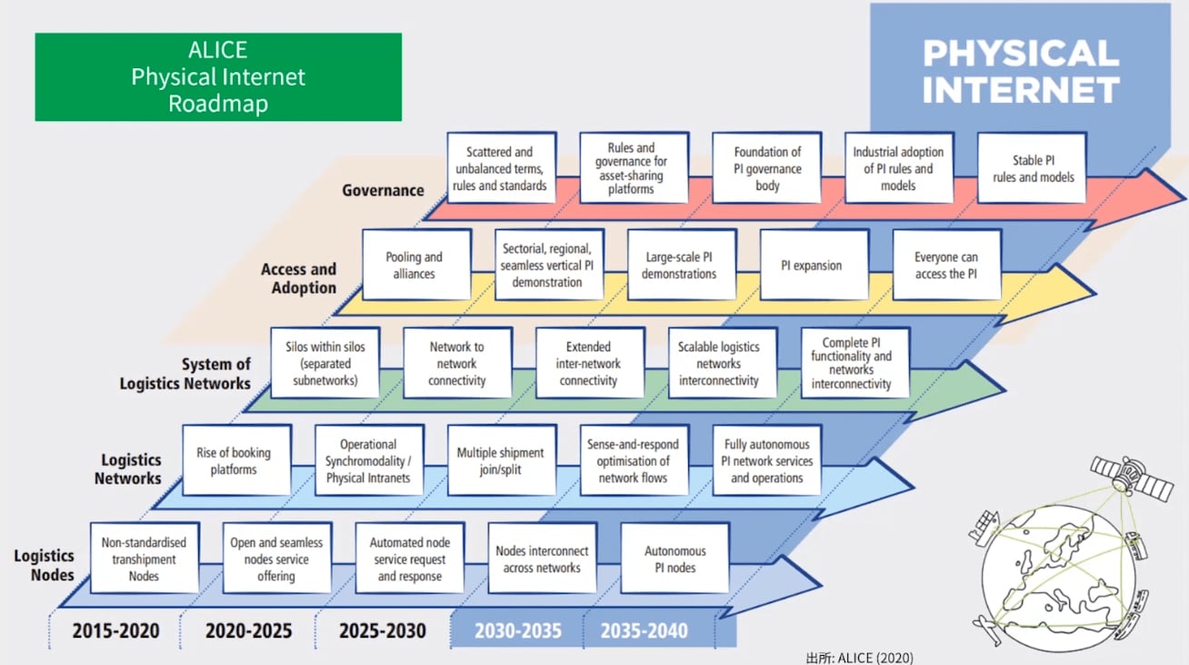 その後、2013年に、ALICEが設立されました。ALICEは、Alliance for Logistics Innovation through Collaboration in Europeの略です。後ほど、この組織によって、ヨーロッパ版のフィジカルインターネットのロードマップが策定されました。