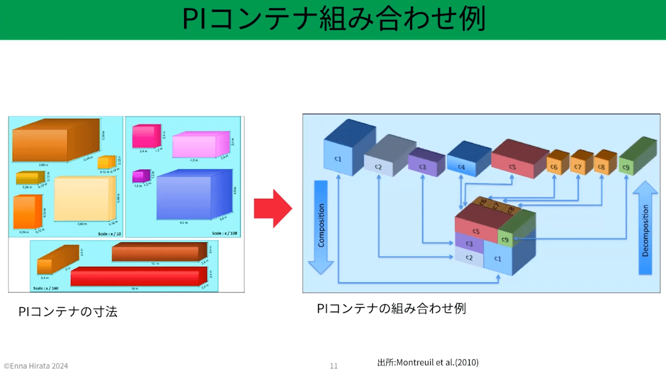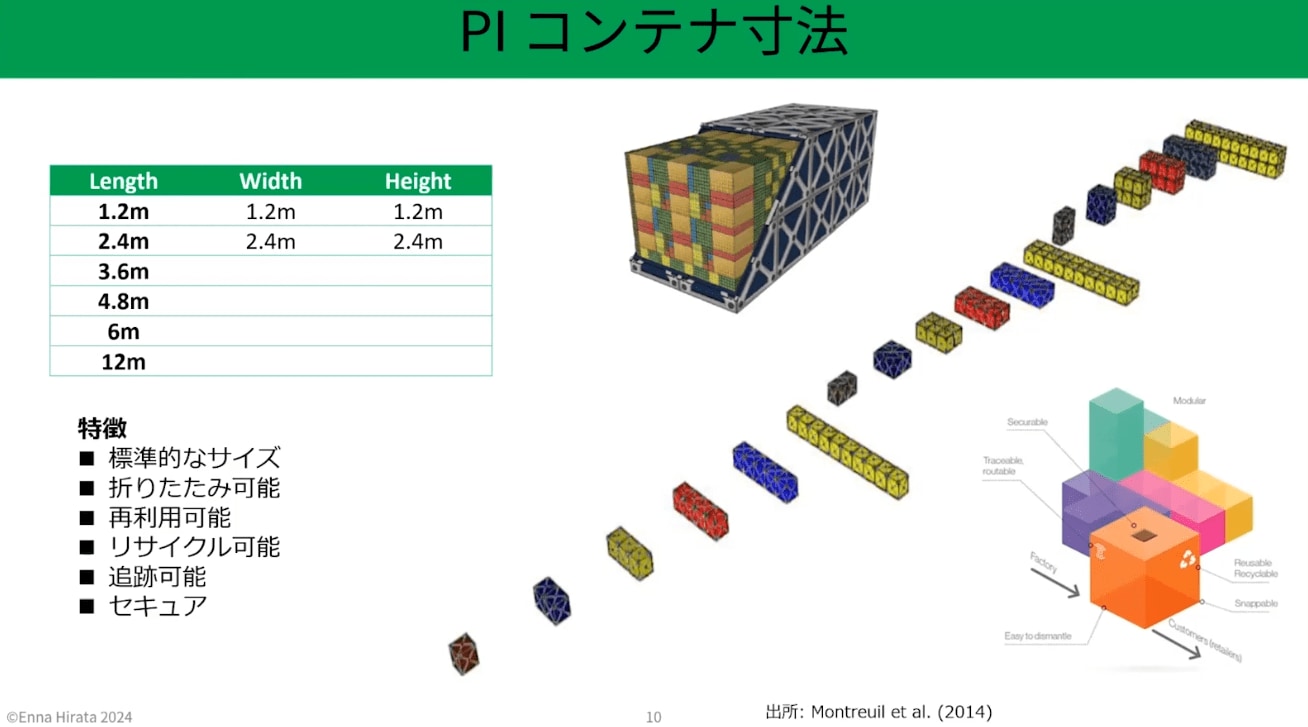 フィジカルインターネットは、基本的にコンテナ貨物を取り扱います。フィジカルインターネットに用いるものは、先ほども伝えたとおりPIコンテナです。 このPIコンテナは標準的なサイズで、環境に優しい材料でできています。スマートで、RFIDまたはGPSで追跡可能です。安全で、連結してより大きなユニットを作ることができます。そして、ほとんどの場合、より効率的な空のコンテナの保管と返却のために、折り畳むことができます。