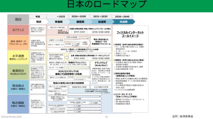 日本では、経済産業省で2021年10月にフィジカルインターネットのプロジェクトが立ち上がり、2022年に日本版のロードマップが発表されました。