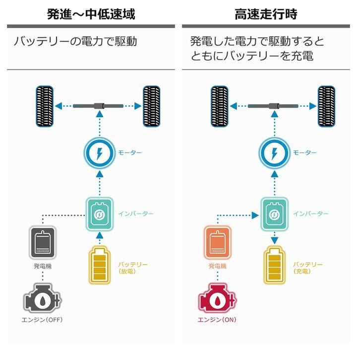 「e-POWER」は、1台の自動車にガソリンエンジンと電気モーターを搭載する点ではハイブリット車だが、エンジンは発電にのみ使用し、走行は電気モーターが担当する。