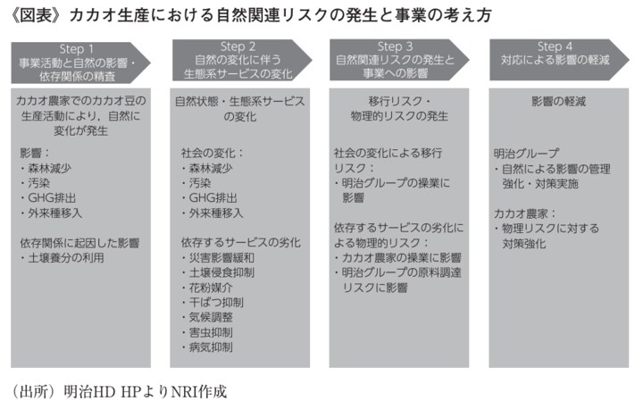その結果、カカオ豆の生産における依存や影響関係が一因となり、自然状態および生態系サービスの変化を引き起こす可能性があると特定しました。その変化によって物理的リスクや移行リスクが発生し、明治グループに財務的影響を及ぼす恐れがあるとし、カカオの持続可能な調達に向けた対応施策の検討と推進を行っています(明治HD HPより)。