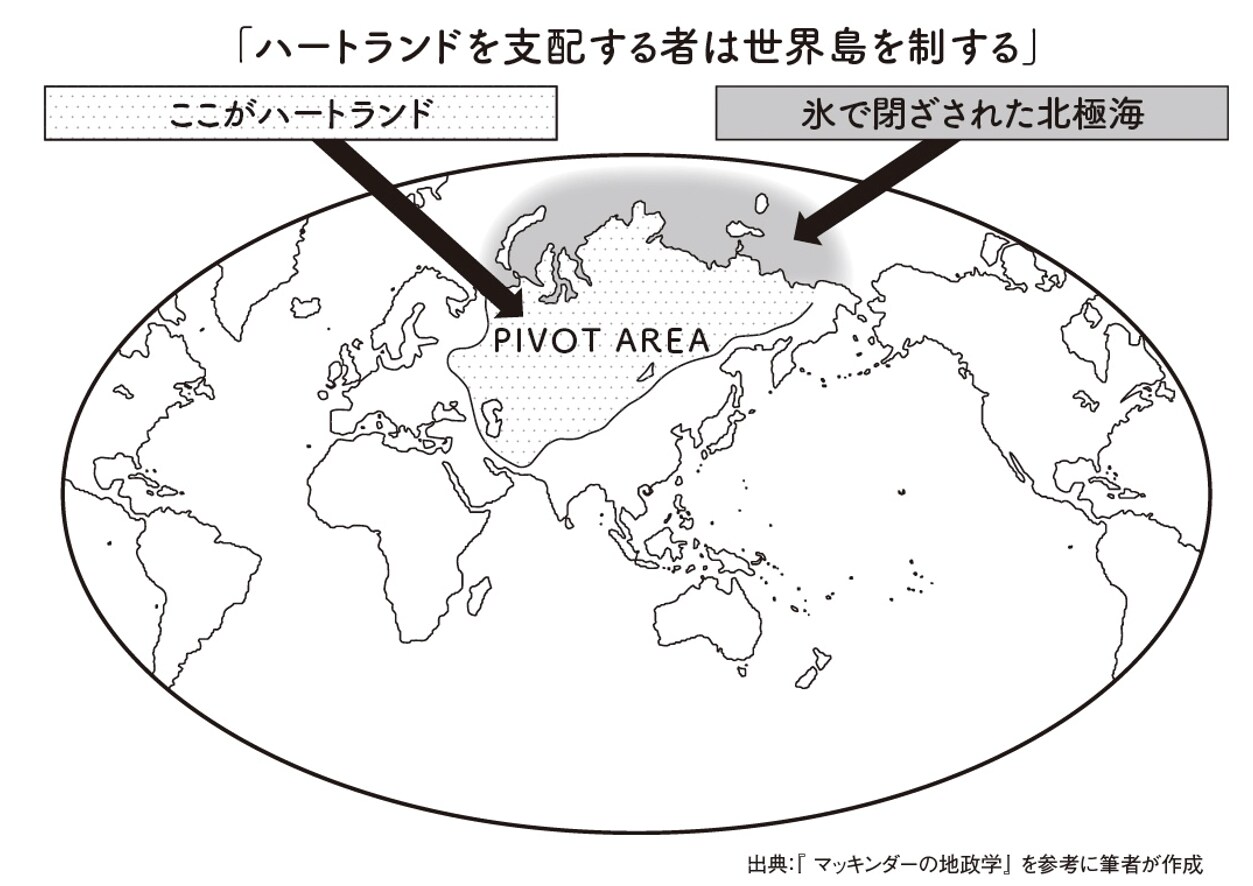 ハートランドは「PIVOT AREA(中心領域)」と書かれた部分だ。北極海沿岸から南にかけて、アジアの半分と欧州の4分の1を含む領域だ。北極海側は氷で閉ざされており海からの交通は不可能で、外部のシー・パワーの攻撃は困難だ。マッキンダーはこの地域を大陸の心臓地帯(ハートランド)と名づけた。