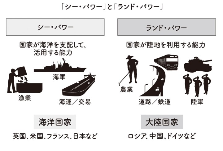 地政学では「シー・パワー」や「ランド・パワー」という言葉が出てくる。シー・パワーとは海洋を支配する能力だ。海洋国家の日本は、シー・パワー大国である。ランド・パワーとは陸地を利用する能力。ロシアや中国は大陸国家であり、ランド・パワー大国だ。