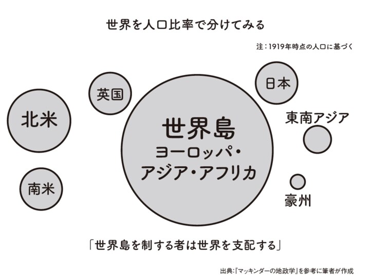 さらにマッキンダーは「世界島」という概念を提唱した。世界島とは陸続きであるヨーロッパ、アジア、アフリカの3大陸の総称で、現在世界人口の75%が世界島にいる。北米と南米はパナマ地域でわずかにつながっているだけで事実上は別々の島だ。