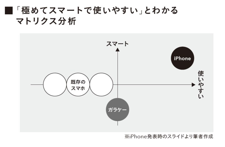 その位置は、マトリクスの第一象限の右上の端のほう、つまり、「これまでの携帯電話やスマートフォンに比べて極めてスマートで、かつそれらよりも極めて使いやすい、そんなデバイスこそがアイフォーンである」と示したのです。