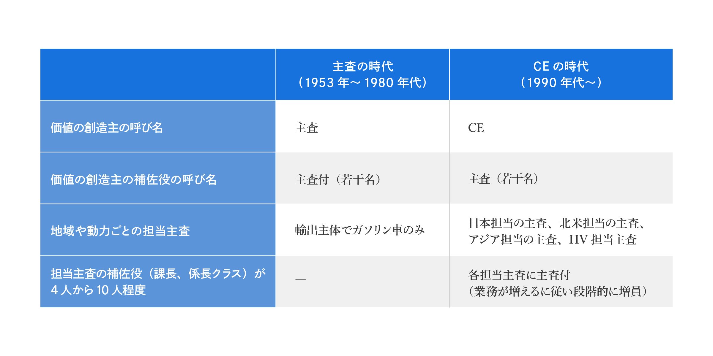 一般的に自動車業界では、意匠承認からラインオフ(量産開始)までを開発期間と呼んでいるため、商品企画会議での承認→CE任命→CE構想書→製品企画会議での開発承認(開発決定)→デザイン→商品化決定会議での意匠承認までを、商品企画(コンセプト創出)フェーズとした。