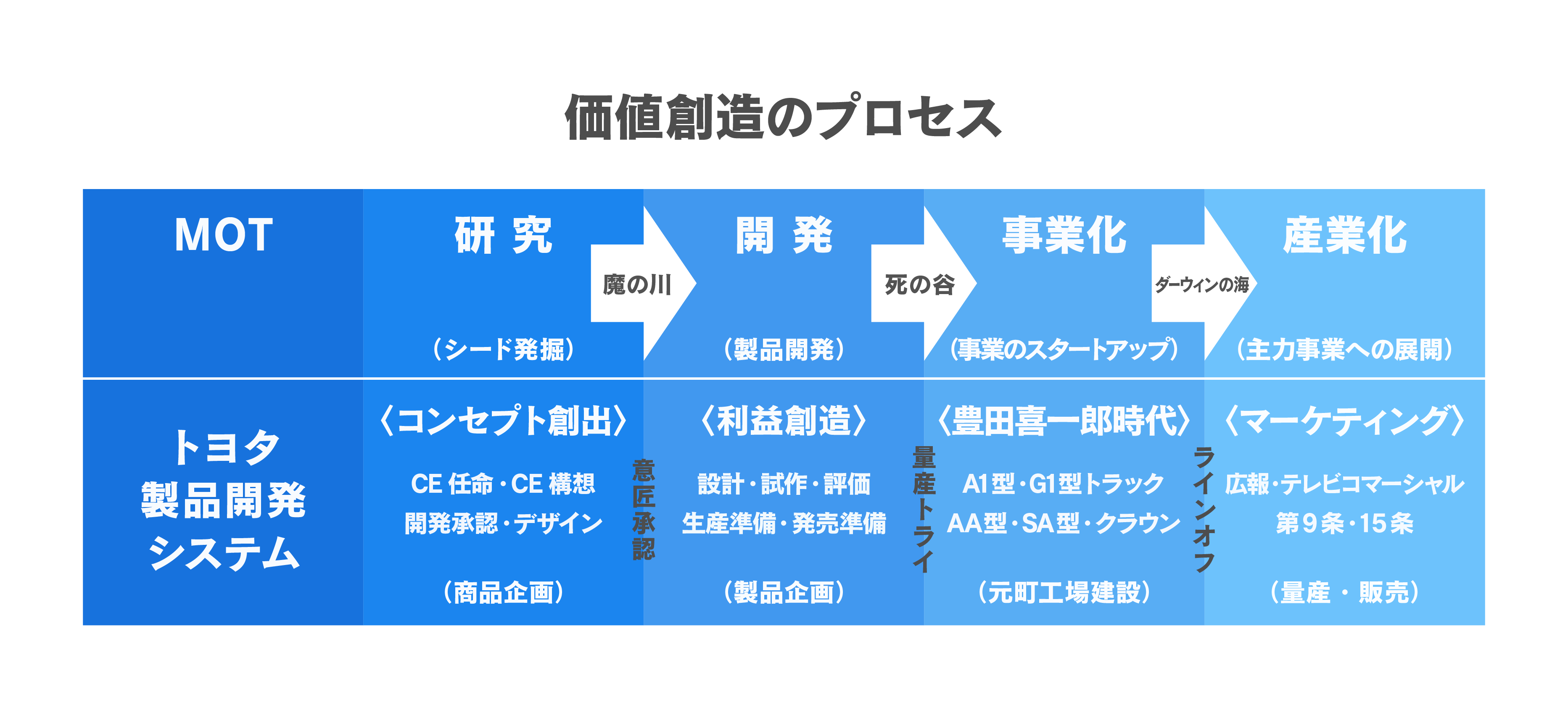 MOTの「事業化」を事業として成立させるための種まきの段階、「産業化」を収穫の段階とすると、トヨタ製品開発システムには、MOTにおける「事業化」はないと考えられる。なぜなら、そのフェーズはトヨタ自動車の創業者である豊田喜一郎氏の時代に終わっているからだ。