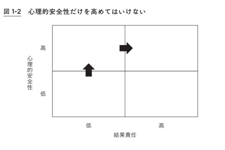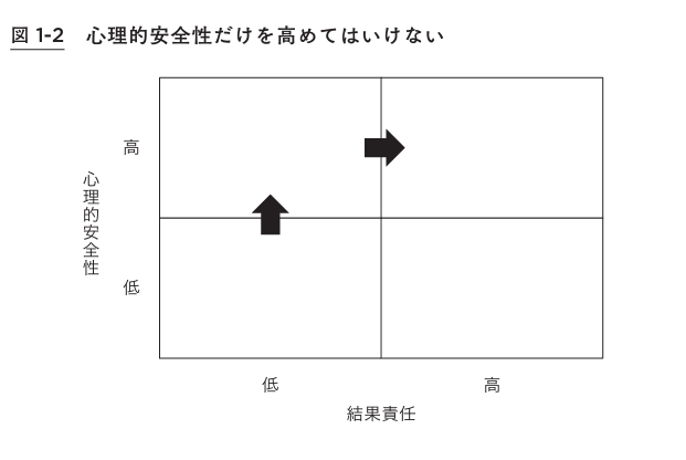 GやIのような状況に陥らないためには、図1-2のように心理的安全性を高めることに加えて、メンバーに対して結果責任を追及することが重要です。なぜなら、心理的安全性の目的は顧客や社会、企業全体の利益を守ることであり、従業員のストレスを減らすことではないからです。