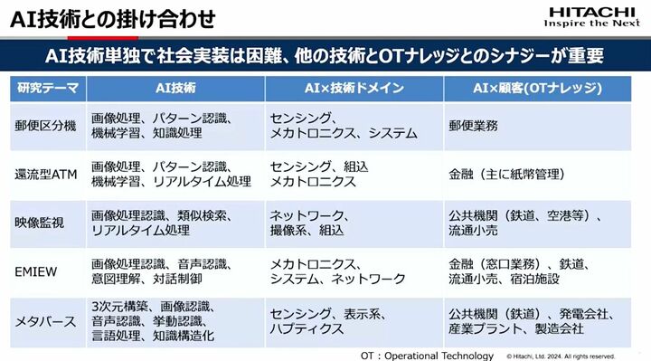 「例えば郵便区分機は、画像処理やパターン認識などのAI技術を、センシング※1、メカトロニクス※2、システム、そして顧客が持つOTナレッジとの組み合わせで成立しています。どんなに性能や精度が良くても、AI技術単独では世の中で使えるものにはならないのです」(影広氏)