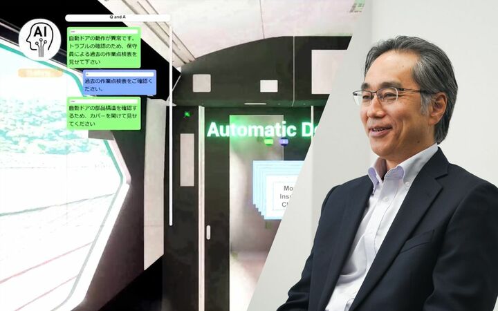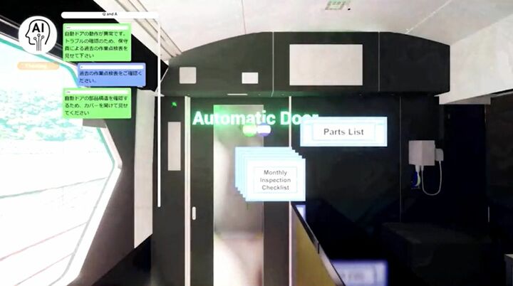 この空間には、車両に関するオペレーションデータ、デザインデータが埋め込まれている。例えば自動ドアの前で生成AIに質問を投げかければ、パーツリスト、作業履歴、マニュアルなどが、実際の自動ドアに紐付けられたかたちで表示される。