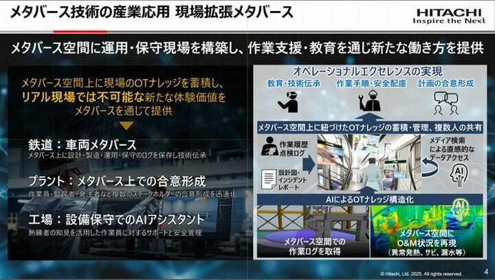 メタバース(仮想空間)はエンターテインメント領域で先行しているイメージが強いが、日立製作所が進めるのは、産業領域の最前線で働くフロントワーカーを支援する「インダストリアルメタバース」だ。