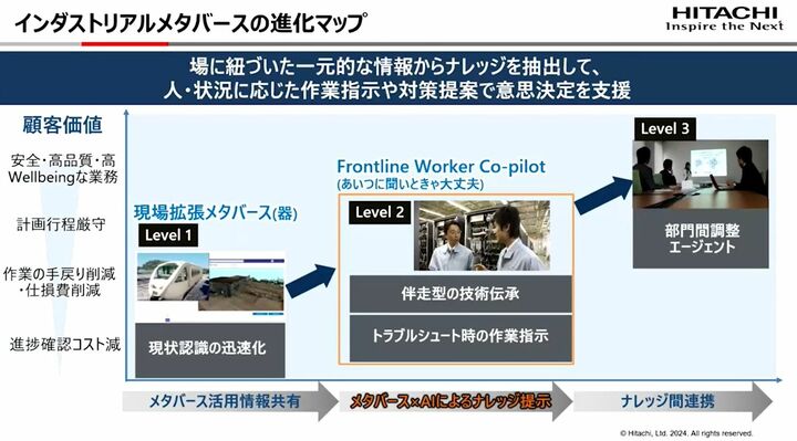 ここまでの取り組みは、日立が掲げるインダストリアルメタバースの「レベル1」に相当する。現場を3D化して現状認識を迅速化する現場拡張メタバースには大きなニーズがあり、すでに多くの顧客から引き合いがあるという。
