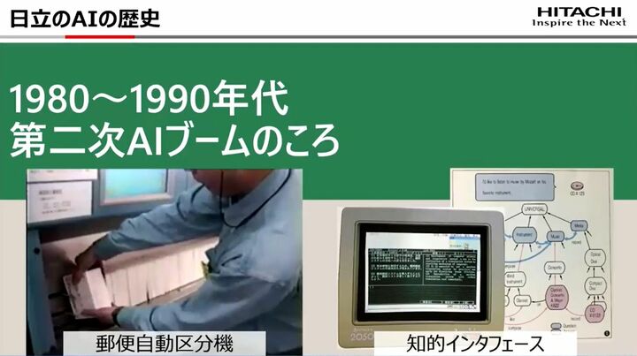 日立のAIの歴史は1960年代から70年代、第1次AIブームに始まる。国産コンピューターの「HITAC」、トランジスタを量産する組み立てシステムにおいて、AI技術による画像認識で検査工程を自動化したのだ。