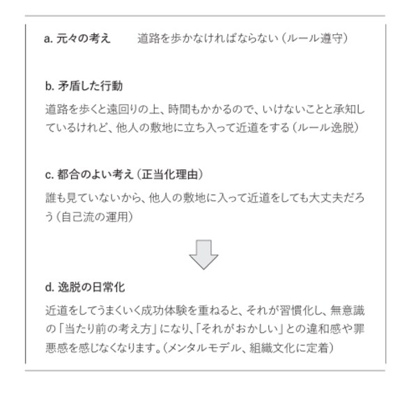 悪いことと知りながら、「これくらいなら大丈夫だろう」などと、間違った行動を正当化するくせ(認知的不協和の解消)が、人間心理にあります。その結果がうまくいくと、その成功体験により、ルール逸脱が日常化し、それが無意識の当たり前の考え方になります。それが共通の組織文化に定着し、事故や不祥事の温床になります。